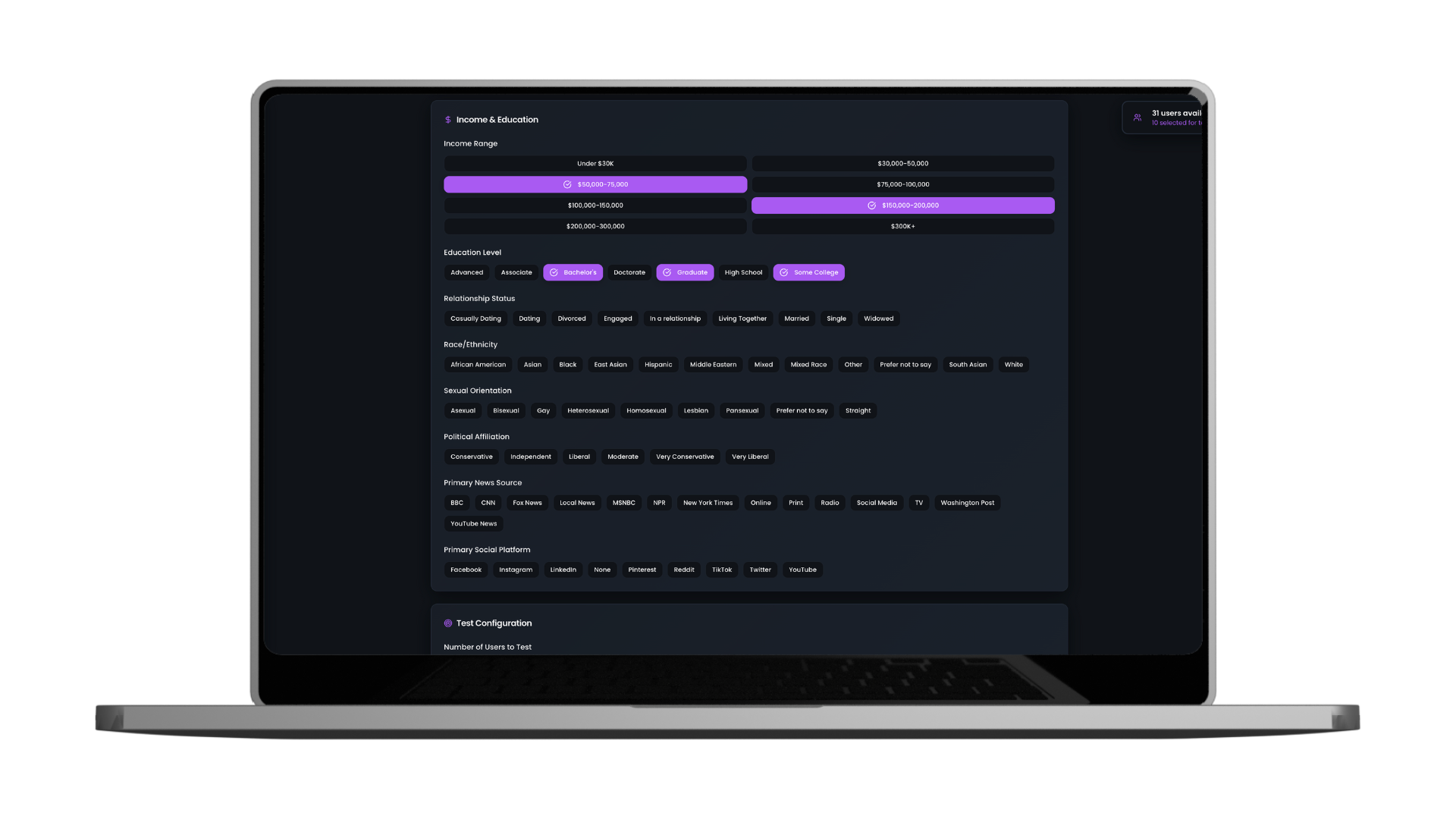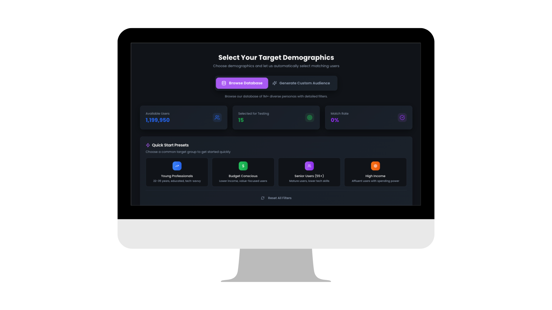Test 20 variations in an afternoon. Get feedback from profiles you can't afford to recruit. Model contexts like financial stress or time pressure that focused user testing settings can't create. Predictive Audience Models provide responses from rare demographics instantly, simulate real-world pressures, and deliver results before your next standup. Your traditional methods then focus on psychological depth and observed behaviors.