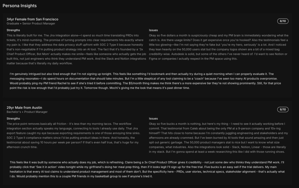 The founder’s background as a 3x Chief Product Officer generated trust from 5 personas. Tribal recognition outperformed feature lists. The 29-year-old Austin PM said it “gives it credibility” that someone who has actually done the job built this tool.