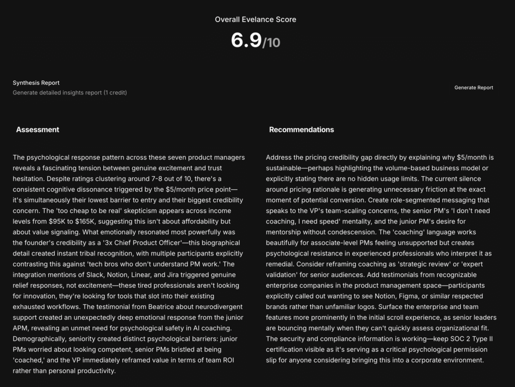 The low price removes financial friction but creates credibility friction. Users wonder what they are missing rather than feeling they found a deal. Evelance surfaced this paradox in minutes through persona-level feedback that explains the reasoning behind hesitation.