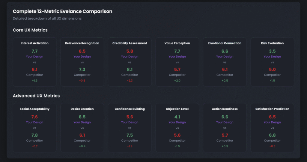 Your homepage moves curious browsers toward commitment. Every element either sparks interest or creates doubt. Evelance compresses weeks of research into 8 minutes by simulating realistic users at scale. You get psychological scores across 12 dimensions, qualitative feedback explaining reactions, and actionable recommendations before you build anything.