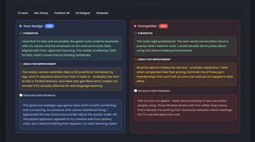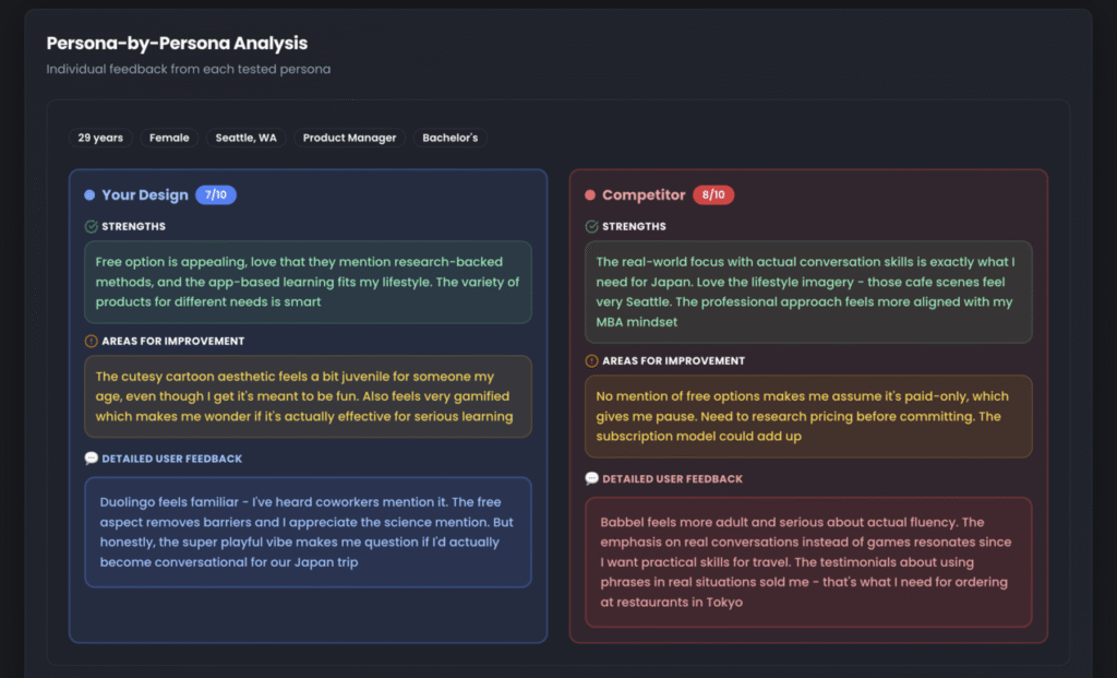 The 27-year-old Portland UX designer gave Duolingo 7/10 and Babbel 8/10, noting Duolingo gave them “nostalgic app game vibes which is both comforting and concerning.” That insight reveals the exact psychological tension no click data shows.
