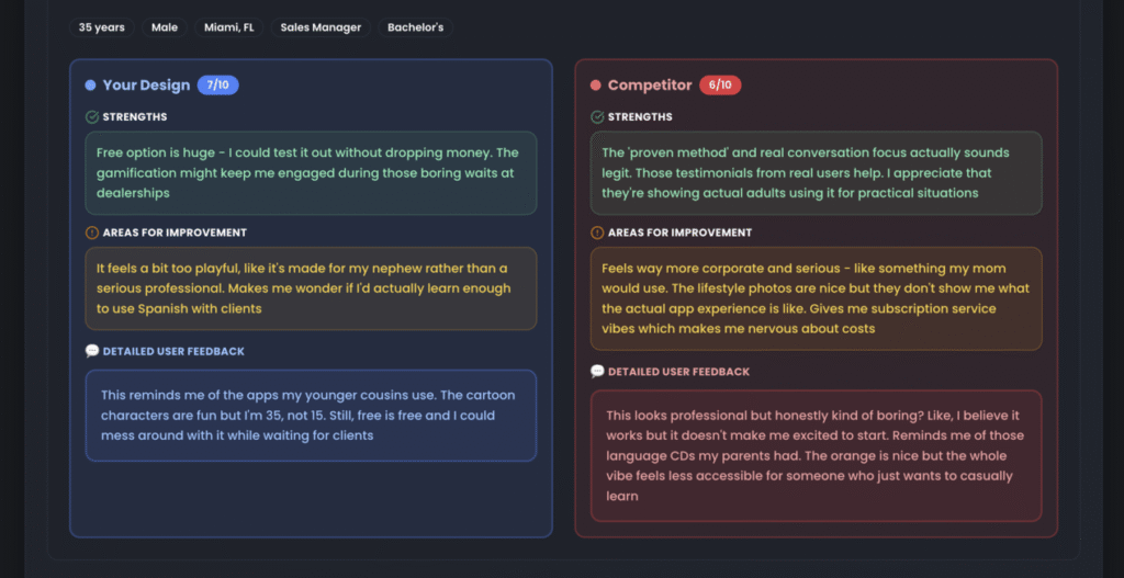 Duolingo’s playful authenticity resonates powerfully with its target users. Babbel’s serious positioning attracts professional learners effectively. Trying to appeal to both segments would weaken each platform’s psychological impact.