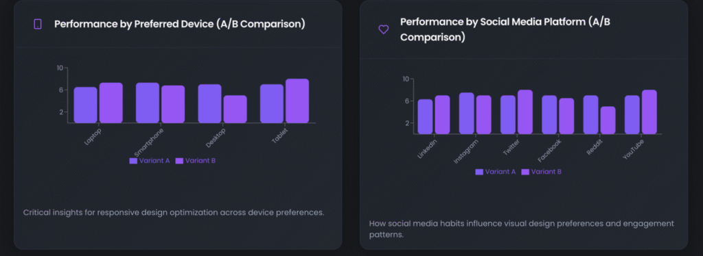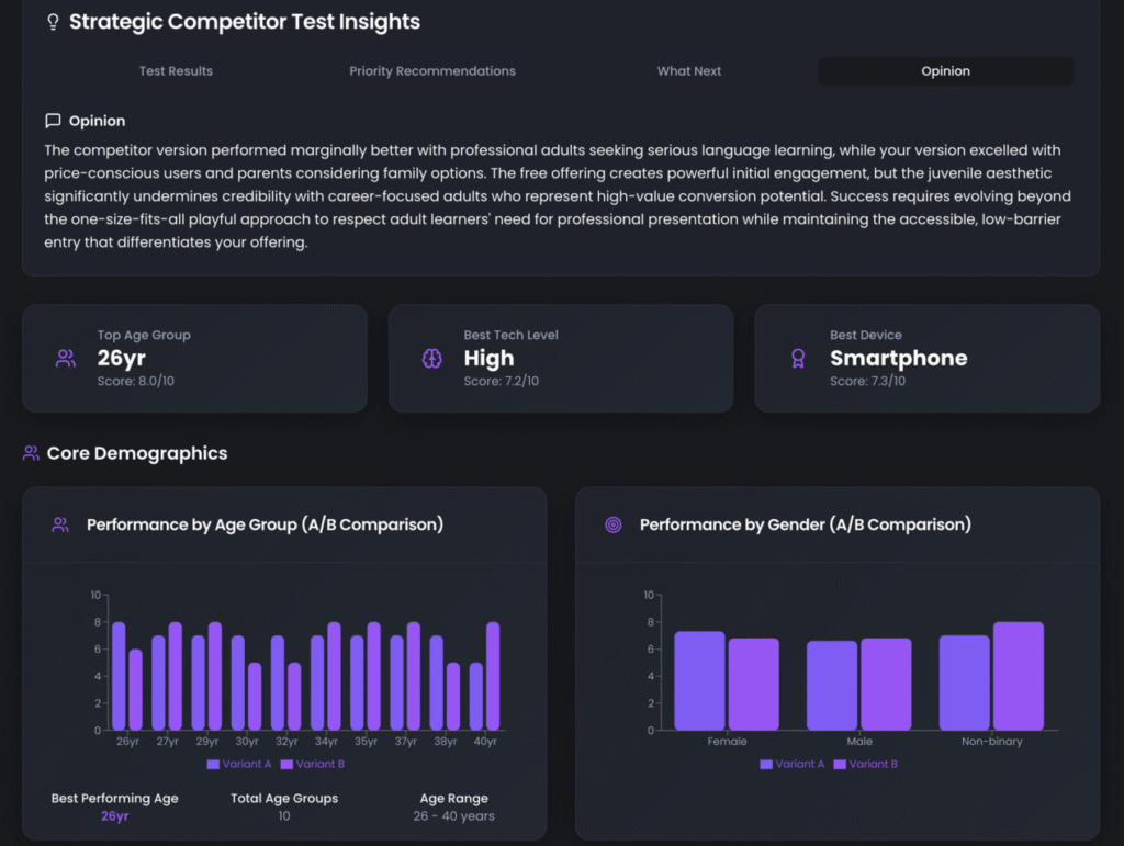 Evelance measured these psychological dimensions across 10 diverse personas simultaneously. The test ran in 8 minutes. Each persona brought different context: