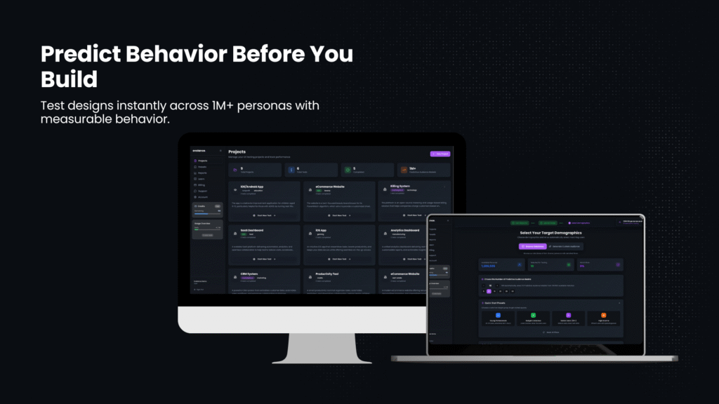Evelance’s Emotional Intelligence transforms static user testing into dynamic behavioral prediction. We recognize that people bring their whole lives to every interaction with your design. Their reactions stem from accumulated experiences, current circumstances, and active emotional states that traditional testing methods ignore. Our system models these complex human realities to show how actual people will respond when they encounter your interface in their natural context, not in artificial testing environments.