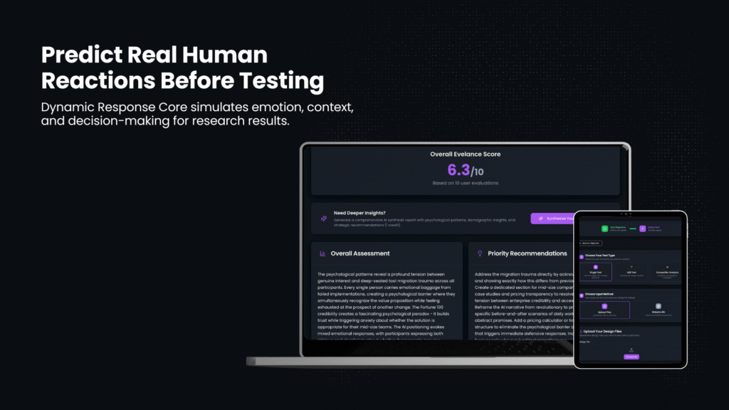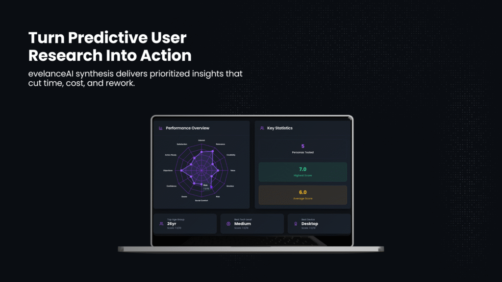 Physical and digital environments profoundly affect how people process information, yet most testing ignores these variables. Evelance’s Emotional Intelligence simulates environmental pressures that alter perception and decision-making. Someone evaluating your landing page in a noisy coffee shop with intermittent WiFi has different patience thresholds than someone browsing from a quiet home office.