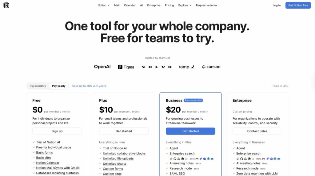 Notion’s pricing structure confused 6 out of 10 personas. The page showed $0 for the free tier, $10 for Plus, then jumped to $20 for Business marked as “recommended” without explaining why.