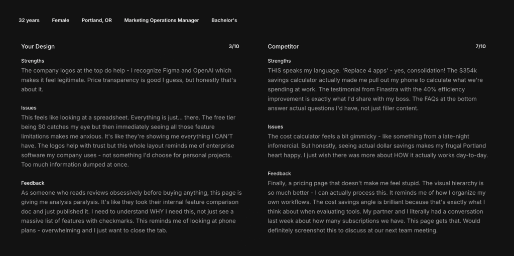 The entire test took 9 minutes. Each persona provided scored feedback across all dimensions plus detailed explanations of their thinking.