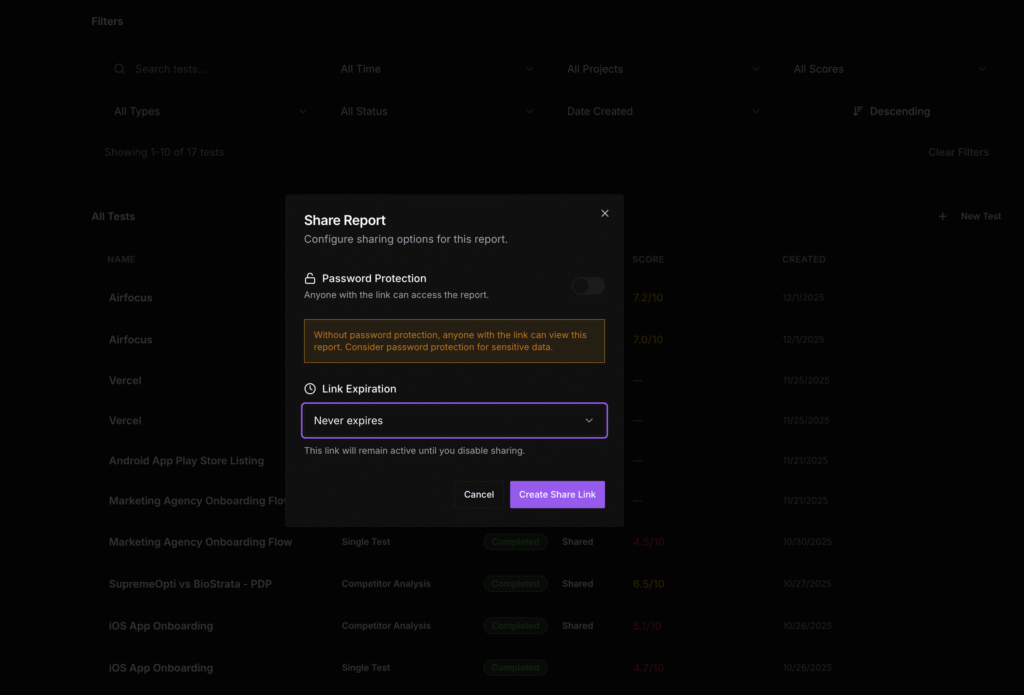 These controls let you make that decision per report rather than accepting a single default for everything. A competitive benchmarking test against a direct rival might need password protection and 7-day expiration. A usability validation shared with your product team might work better as a public permanent link.