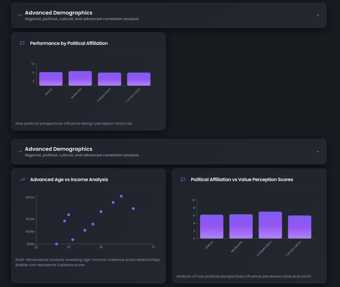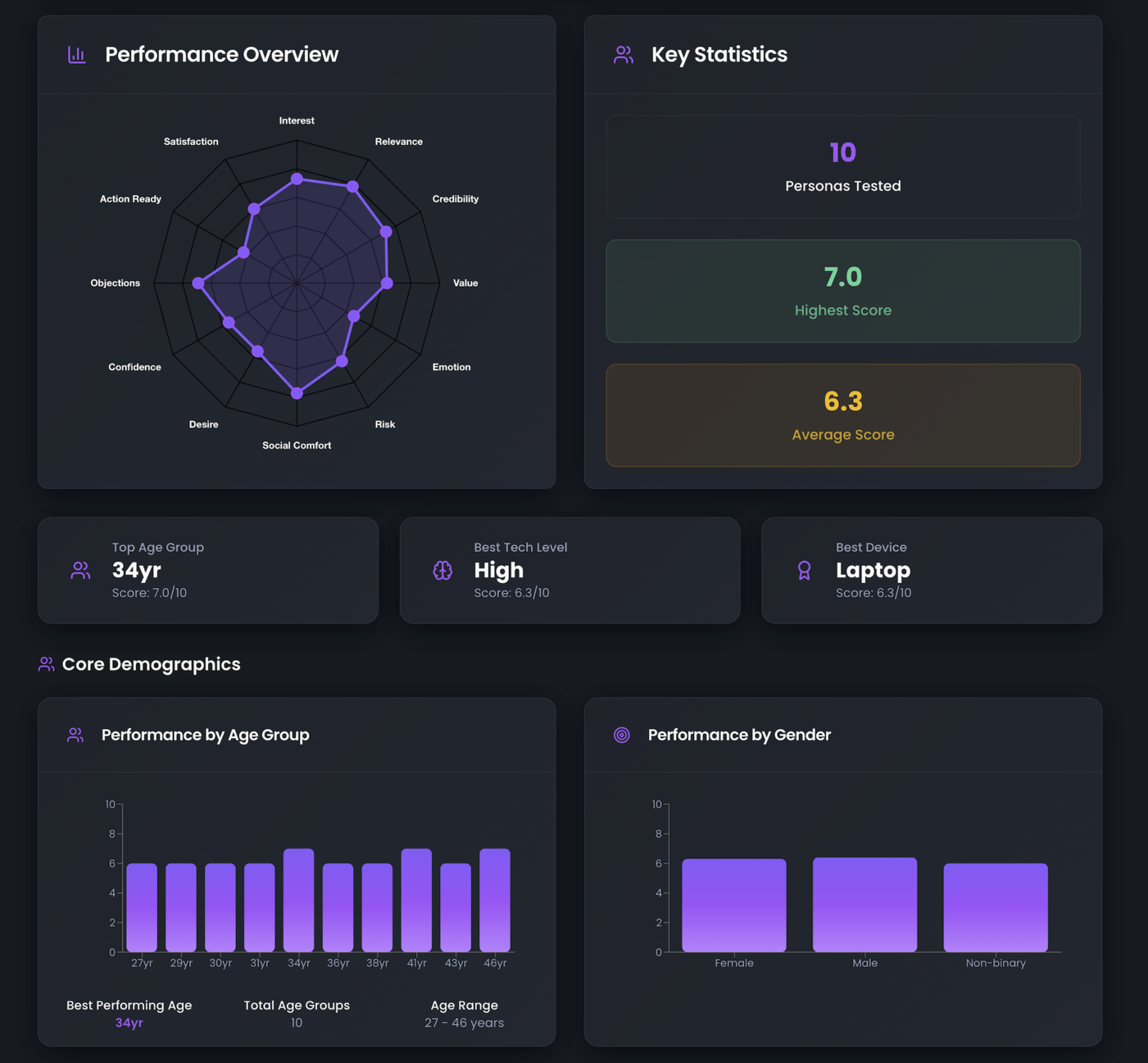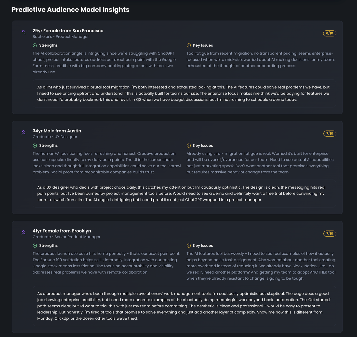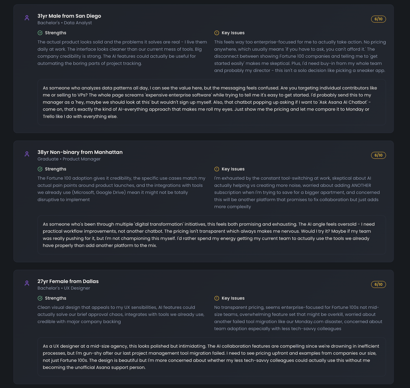 We ran Asana’s homepage through Evelance with a predictive audience of product managers, UX designers, and analysts in California, Texas, and New York. The group included early and mid-career professionals in SaaS, balanced between analytical and intuitive decision styles. The goal was to measure first impressions and trust at the curious stage, the point where interest begins but commitment has not formed. The analysis explores how credibility, pricing clarity, and emotional fatigue shape perception before a single button is clicked.