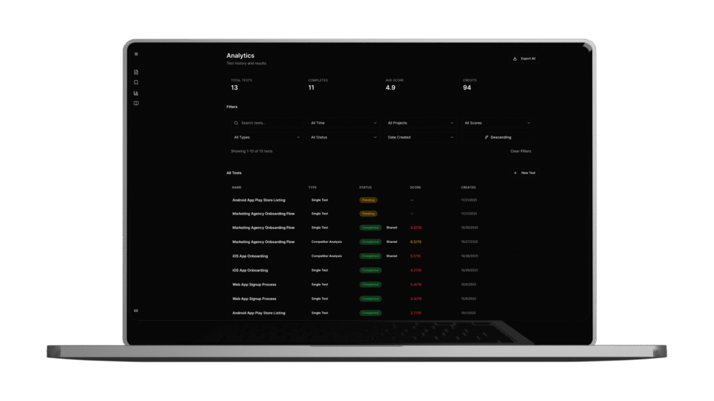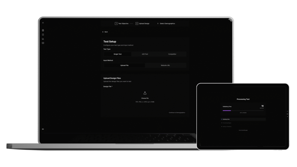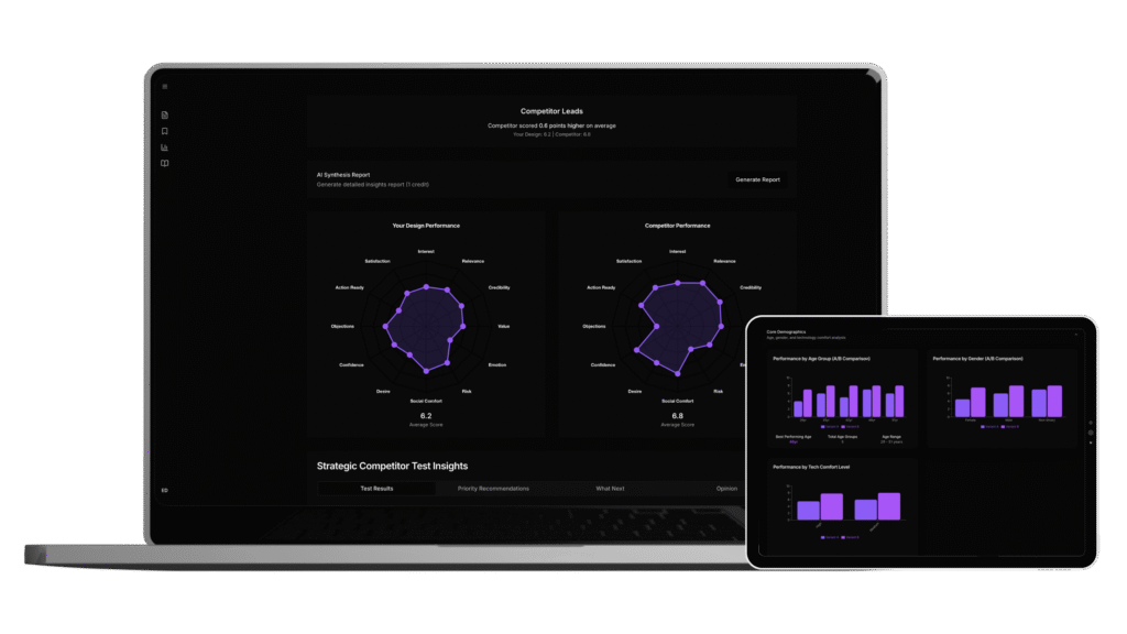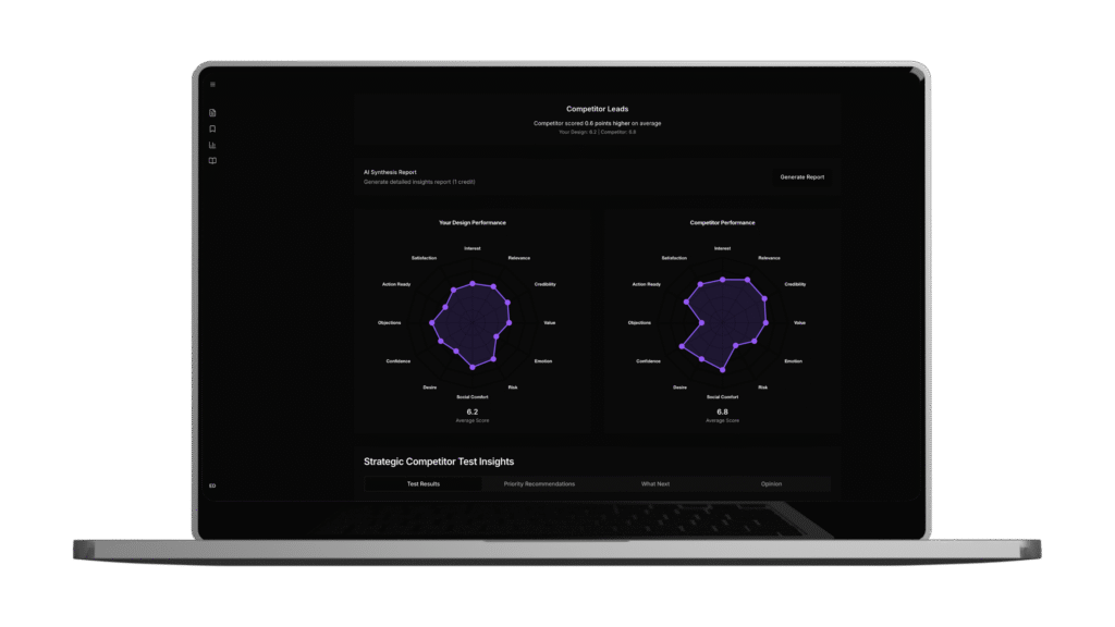 Our competitor analysis feature tests your designs against competitors using the same predictive models in a single study. Teams have reduced competitive analysis costs by up to 66% through this approach. The insights arrive faster too, since you’re not coordinating multiple recruitment efforts.