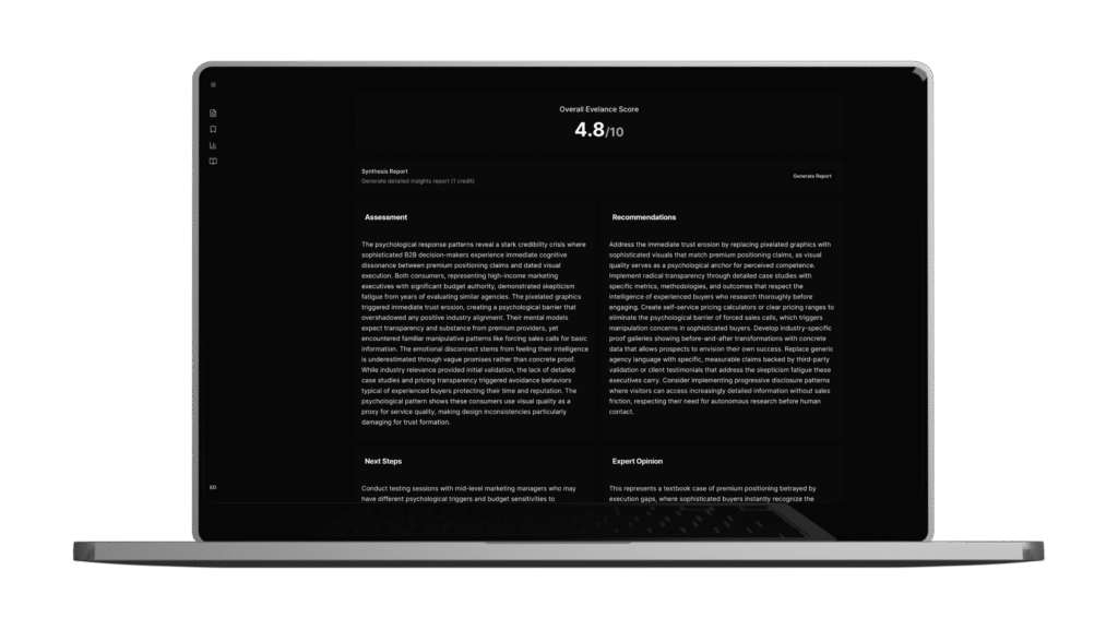 Our Synthesis feature, powered by evelanceAI, transforms raw outputs into executive-ready reports for a single credit. The automation reduces analysis time by 50%, helping teams move from testing to implementation faster.