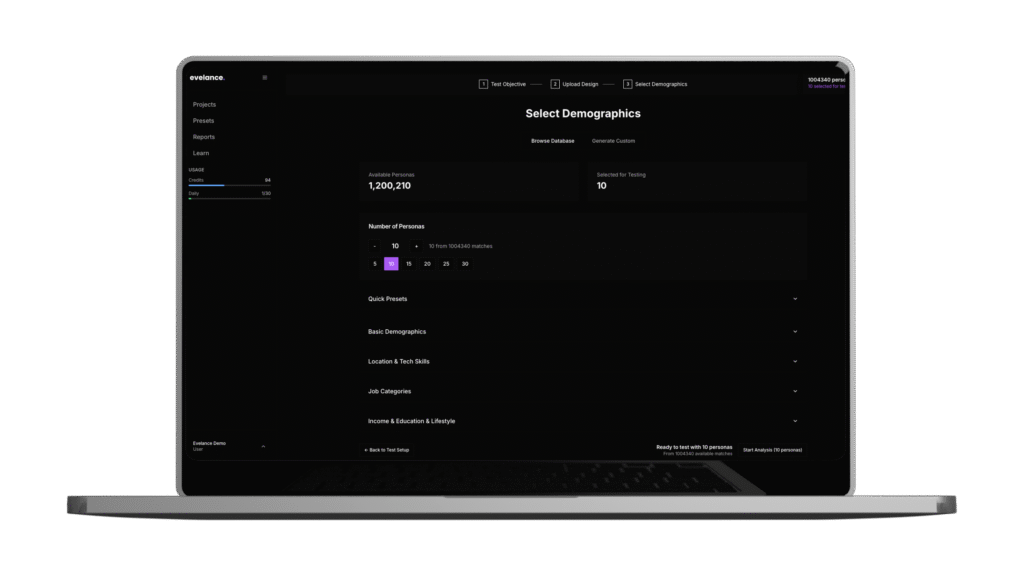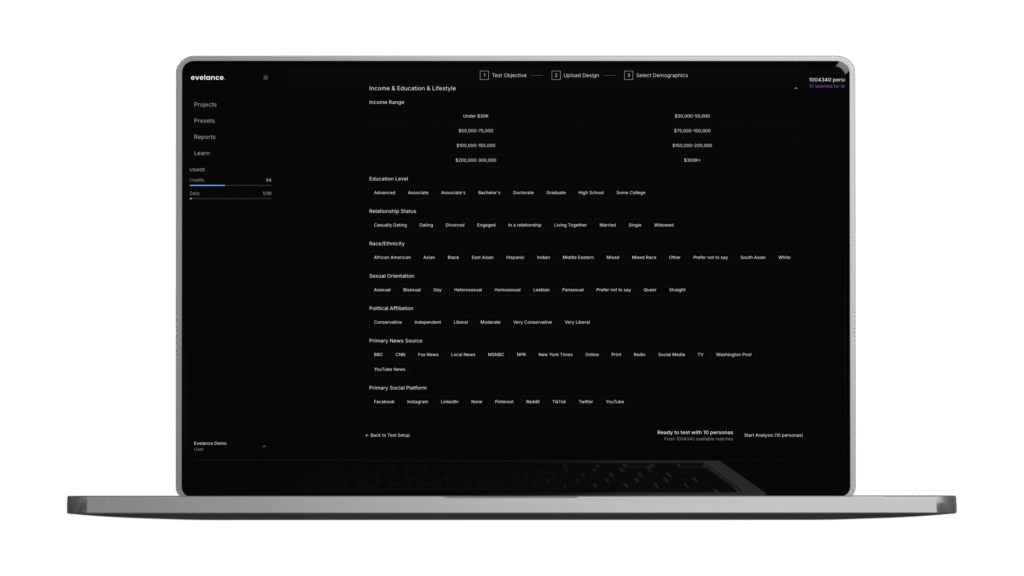 Evelance gives you access to over 2,000,000 personas, filtered by profession, health conditions, accessibility needs, and behavioral context. Tests complete in minutes rather than days. And because we don’t require incentives or scheduling, the cost structure looks completely different.