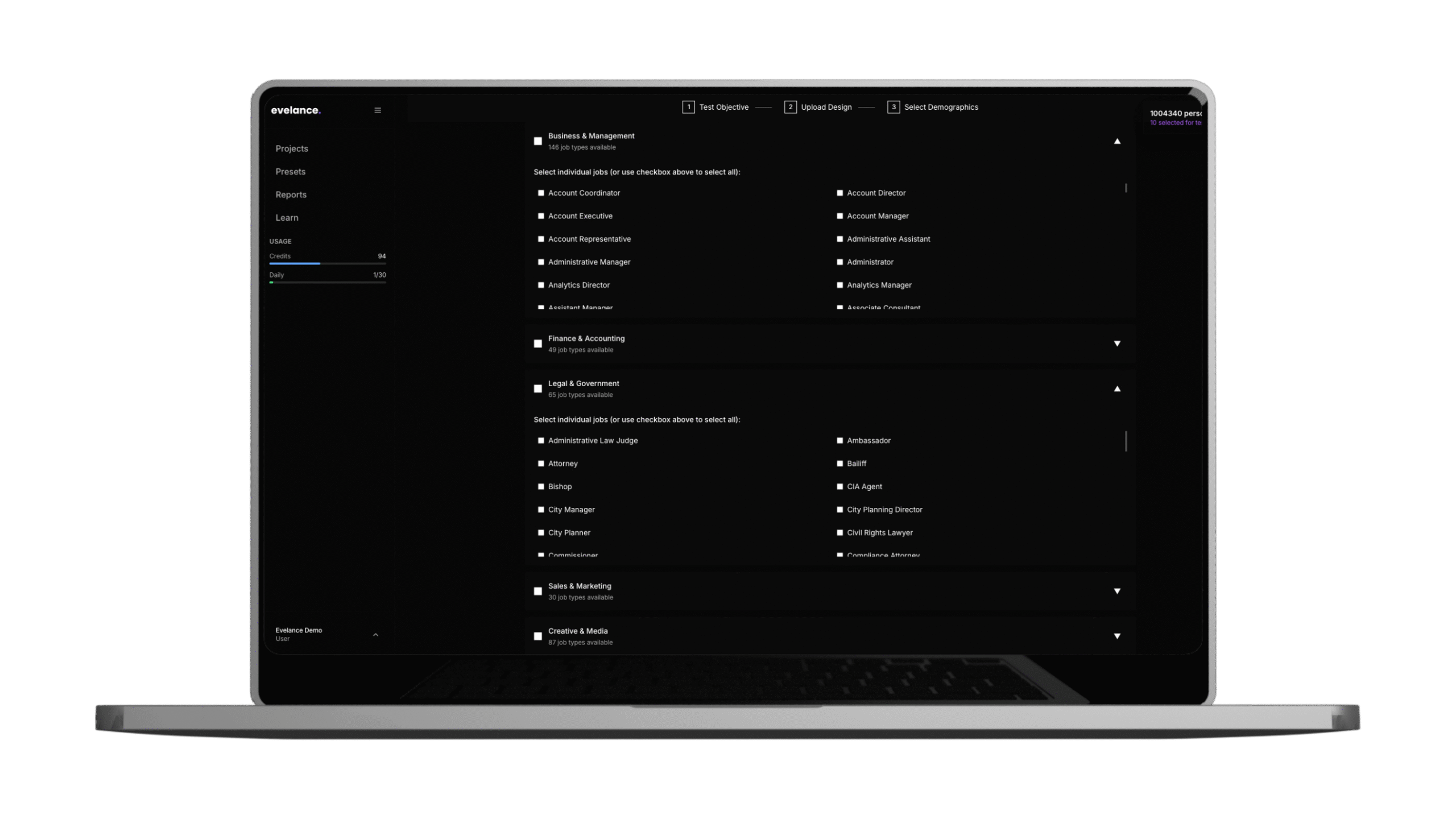 User research shouldn’t take longer than building the feature. With Evelance, you can test interfaces against personas and get feedback explaining exactly what users think and why.